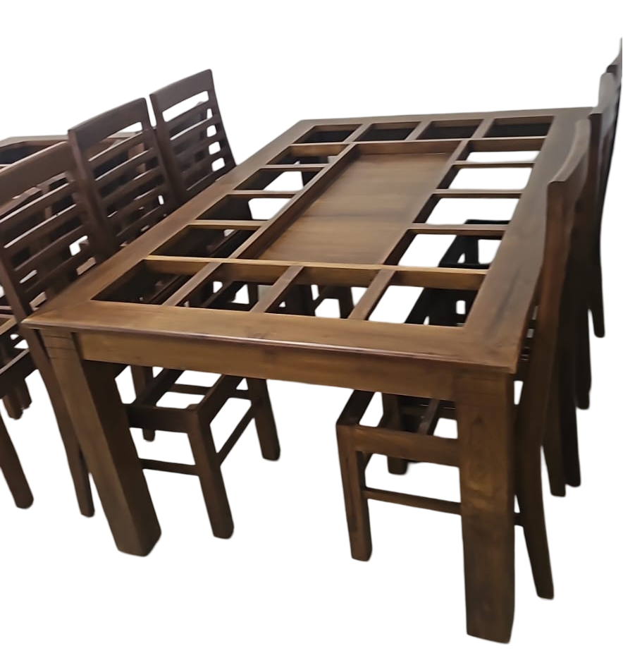 This handcrafted teak dining set blends timeless design with durability. Perfect for family meals, it adds warmth and elegance to any dining space.