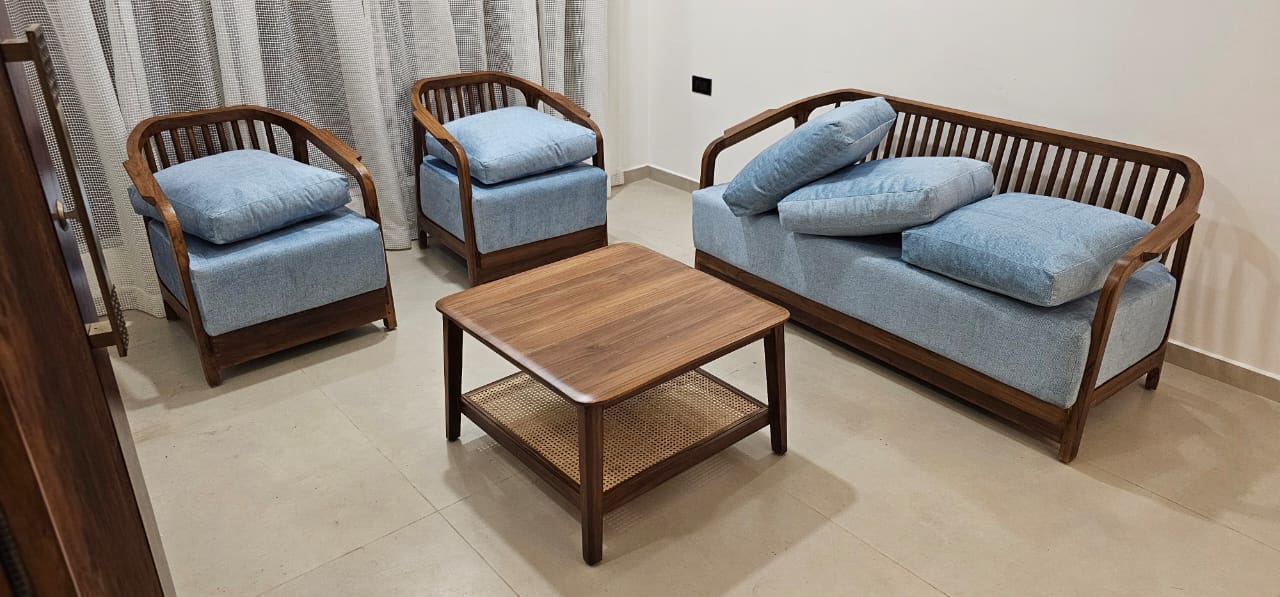 Elegant grayish-blue sofa set crafted with premium teak wood. Combines modern comfort with classic durability, perfect for stylish, cozy living spaces. Ideal for contemporary home interiors.