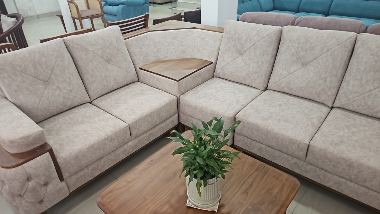 Experience luxury with our L Shape Sofa Set upholstered in soft suede fabric. Built with a strong wooden frame, it offers spacious seating, plush comfort, and elegant style.