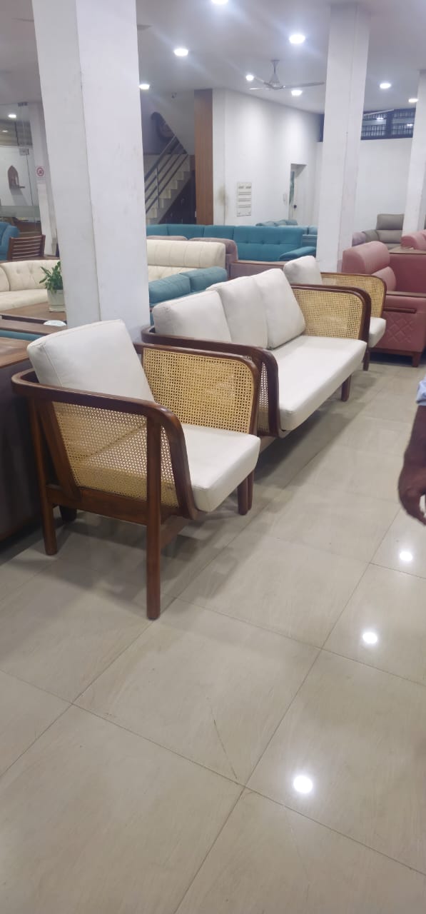 Elevate your living room with a teak wood sofa set featuring elegant off-white upholstery. Experience the perfect blend of durability and classic style.
