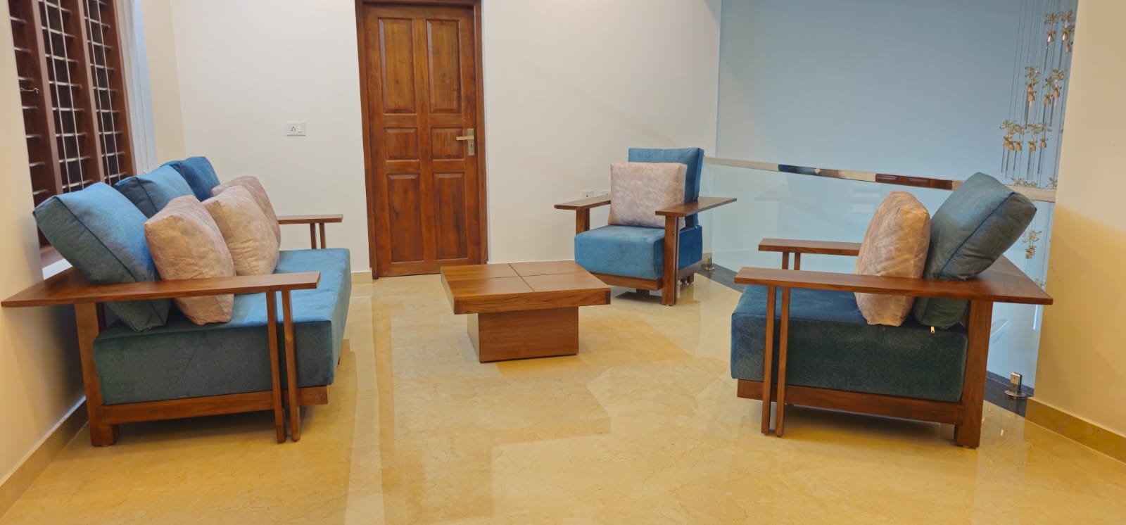 Solid Teak Wood 6 Seater Sofa Set with premium fabric upholstery. Elegant design, durable build, and perfect for modern living rooms. Comfortable, stylish, and long-lasting.
