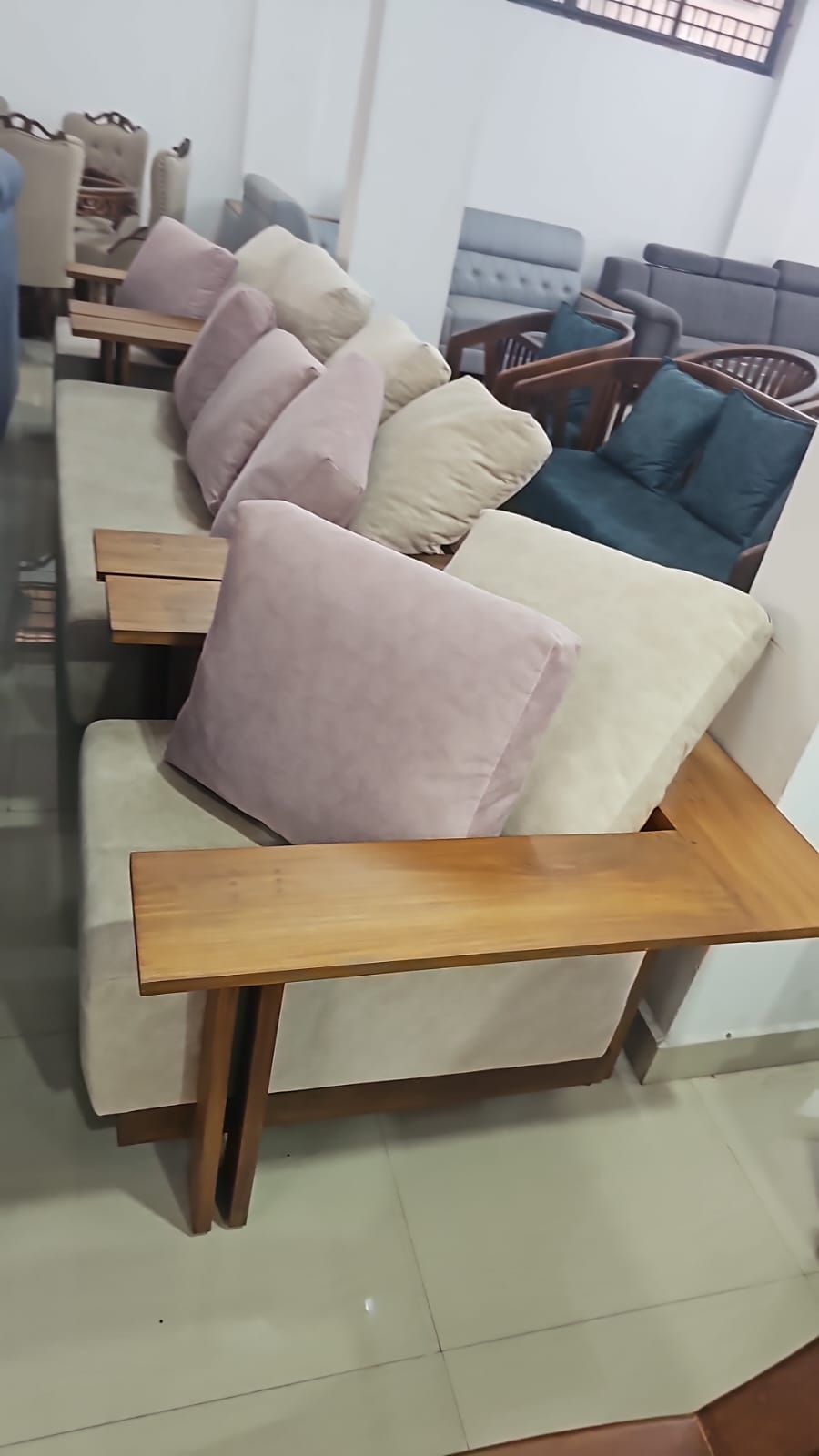 This wooden sofa combines elegance and durability, making it a perfect addition to any living room. Crafted from high-quality wood, it offers both comfort and a timeless look.
