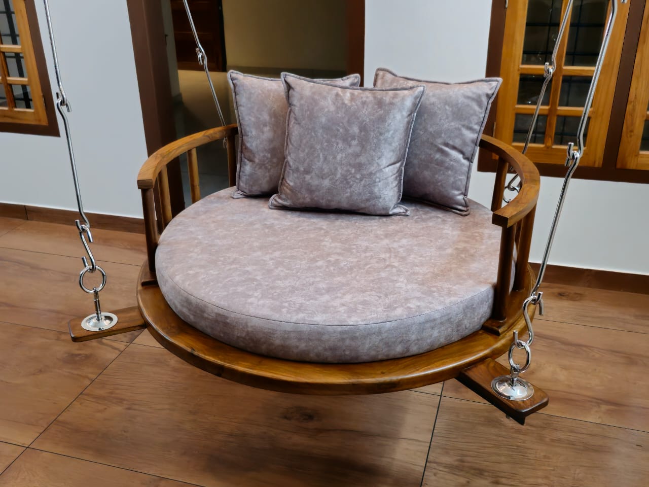 Crafted from solid teak wood, this modern round cane swing blends elegance with durability. Its natural finish and stylish design make it a perfect addition to any indoor or outdoor space.